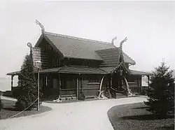 Façade du pavillon de Suède et de Norvège à l’exposition universelle de Paris de 1878[33]. Remonté dans le parc de Bécon à Courbevoie, toujours existant, il accueille, avec un autre bâtiment auquel on l'a adossé, le musée Roybet-Fould.- Maisonnette de boulanger d’Åflo annexe d’Offerdal, musée plein air Skansen sur l’île Djurgården, archipel de Stockholm, bel exemple de pal de pignon chantourné.