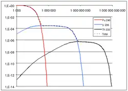 - le temps du plutonium 240 : tant que l'on ne dépasse pas la demi-vie du plutonium 240, la radioactivité du plutonium reste sensiblement constante. Pendant ce temps, la radioactivité de l'uranium 236 croît linéairement en fonction du temps (la pente de la courbe est de 1), et le thorium 232 croît comme le carré du temps (la pente de la courbe est de 2). Quand on dépasse la demi-vie du plutonium (entre 10 000 et 100 000 ans), son taux de radioactivité baisse significativement, et devient inférieur à celui de l'uranium 236 ;