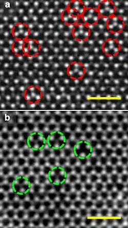 Défauts ponctuels vus au MET (a, atome de S substitué par Mo) et lacunes (b, atomes de S manquants). Echelle barre : 1 nm[1].