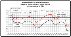 Comme le paiement des intérêts sur la dette déjà existante pèse sur le budget des administrations publiques, on mesure également le « solde primaire des finances publiques », qui est égal au solde budgétaire des finances publiques avant de retrancher la valeur des intérêts (« déficit primaire » lorsque le solde est négatif, « excédent primaire » lorsqu'il est positif).
