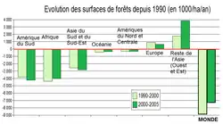 Dans la seconde moitié du XXe siècle, les trois grandes zones de déforestation active, par taille décroissante de surfaces concernées sont : l'Amazonie, l'Afrique équatoriale et la zone Malaisie/Indonésie en Asie. Selon la FAO[45], c'est en Amérique du Sud que la perte nette de forêts a été la plus élevée de 2000 à 2005 (environ 4,3 millions d’hectares par an).