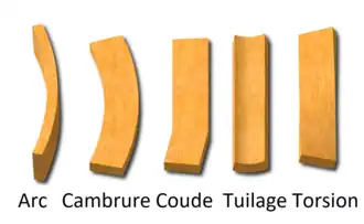 - cambrure ou flèche de chant (anglais : crook) : courbure d'une pièce de bois dont les rives sont devenues convexes ou concaves dans le sens du fil[2].
