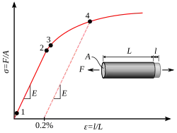 où ɛe est la déformation élastique, réversible (récupérable à la décharge), liée à la contrainte au travers de la loi d’élasticité (σ= Eɛe) et où ɛp la déformation plastique, irréversible ou résiduelle[1].