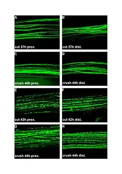 Lorsqu'une fibre nerveuse est sectionnée ou écrasée, la partie distale à la lésion (c’est-à-dire la portion de l'axone séparée du corps cellulaire contenant le noyau) va dégénérer selon un processus appelé dégénérescence wallérienne.