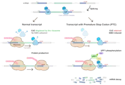 Dans les ARN messagers eucaryotes, le codon stop qui termine le cadre de lecture ouvert est majoritairement situé dans le dernier exon. Le NMD est un mécanisme qui se déclenche lorsqu'il existe un codon stop précoce dans l'ARNm qui soit localisé en amont du dernier exon. Ceci peut résulter d'une mutation ou d'une erreur de maturation ou d'épissage.