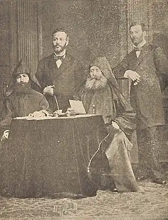 Une délégation arménienne menée par Mkrtich Khrimian (accompagné notamment de Minas Tchéraz[15]), et composée d'un autre archevêque ainsi que par deux députés de l'Assemblée arménienne[13], se rend au congrès avec l'assentiment de Nersès Varjapétian[7], alors patriarche arménien de Constantinople, pour y porter un projet d'autonomie administrative pour l'Arménie inspiré du statut du Liban de 1861[5],[12],[16],[13],[17]. Ce projet prévoit un gouverneur arménien, en poste à Erzurum, désigné par le gouvernement ottoman, un programme de réformes fiscales judiciaires, policières, etc. dont le déploiement serait contrôlé par une commission internationale[13], mais aussi des milices mixtes chrétiennes-musulmanes, le suffrage masculin ou encore l'utilisation locale des revenus fiscaux[12]. Sur le chemin du congrès, la délégation se rend dans les capitales européennes pour tenter d'influencer les diplomates qui se rendront à Berlin[12]. À Londres, elle rencontre le ministre des Affaires étrangères britannique, Lord Salisbury, qui ne lui fait aucune promesse[12]. Ses rencontres avec des diplomates à Paris et à Rome sont tout aussi infructueuses[12],[7]. Parallèlement, Khosrov Nar Bey Kalfayan est envoyé à Saint-Pétersbourg pour remettre au tsar Alexandre II un mémoire demandant l'autonomie des provinces arméniennes[7].