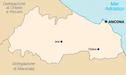 Dans sa configuration définitive de 1831, elle confinait à l’ouest et au nord avec la délégation d'Urbino et Pesaro, à l’est avec la mer Adriatique, au sud avec la délégation de Macerata.