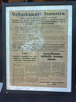 Dans la nuit du , le comité exécutif ordonne aux Gardes rouges d'arrêter les membres du sénat, dirigés par Pehr Evind Svinhufvud et de nombreux autres grands hommes politiques de droite, dont 33 membres du parlement[4]. Cependant, cela échoue complètement. L'état-major suprême des Gardes rouges reporte le coup d'État d'une journée en raison de préparatifs inachevés, de sorte que les sénateurs sont informés du mandat d'arrestation à leur encontre, par un document public distribué prématurément ce qui leur donne juste le temps de se cacher. La réunion du Parlement du est bloquée et quelques membres sont arrêtés.