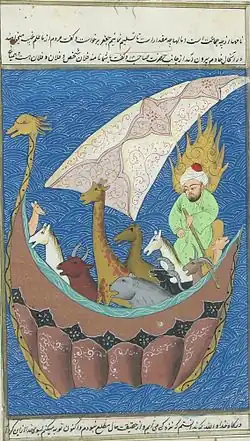 La version coranique du déluge diffère sensiblement de celle de l'Ancien Testament. D'une part, il ne s'agit pas d'un déluge universel (seule la communauté de Noé est visée), il a pu être local comme le soutiennent certains exégètes selon Tabari, ou mondial mais pas au point de recouvrir les montagnes[18],[19]. De plus, Noé, ancêtre de toute l'humanité, est un prophète dans le Coran. Enfin, les personnes croyantes ont embarqué avec lui et sa famille. Le Déluge est présenté comme une catastrophe parmi d'autres. Le Coran qualifie le récit du Déluge comme un événement que les oreilles fidèles conservent (Coran, LXXIX:11-12).