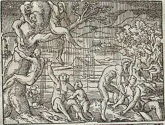 Après Pindare, la Pyrrha d'Épicharme (aujourd'hui perdue) a vraisemblablement évoqué le déluge et l'arche qui aurait permis à Deucalion et Pyrrha d'y échapper[2]. Les Météorologiques d'Aristote gardent aussi une trace de l'événement qui s'est abattu « surtout sur les contrées helléniques, et parmi elles sur la vieille Hellade[3] ». Il faut cependant attendre les Métamorphoses d'Ovide pour avoir le premier récit complet des événements : Zeus, indigné par la conduite impie des hommes qu'il a pu vérifier chez Lycaon, réunit les dieux pour leur faire part de sa décision de détruire l'humanité, leur promettant « une race d'hommes meilleure que la première[4] ». Aidé de Notos, d'Iris et de Poséidon qui commande aux dieux fleuves, il recouvre la terre sous les eaux, seul restant émergé le sommet du Parnasse où Deucalion et Pyrrha parviennent dans une « frêle barque ». Ceux-ci reçoivent un oracle de Thémis qui leur enjoint de « jeter derrière eux les os de leur grand-mère » ; comprenant qu'il s'agit de simples pierres (leur grand-mère étant Gaïa, la Terre), il s'exécutent et engendrent ainsi une nouvelle race d'hommes.