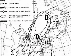 Le front, que l'on voit sur la carte d'analyse de 1200 TU le 14 juillet, 8h locale, était supporté en altitude par un creux barométrique à 500 hPa d'intensité moyenne. La carte montre également la formation d'une dépression en surface, juste au sud-ouest d'Ottawa (Ontario). Cette cyclogénèse semble directement liée à l'amplification du creux d'altitude. La formation de cumulonimbus de forte extension verticale était favorisée en cette matinée par de l'air très chaud et très humide en surface, une intrusion d'air plus sec dans les niveaux moyens, une divergence des vents en altitude et d'une convergence accrue en surface à cause de la dépression[3].