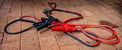 Câble de démarrage.Le démarreur électrique apporte un confort d'utilisation indéniable aux véhicules à moteur thermique. Cependant, la nécessité d'utiliser une batterie puissante augmente le coût et le poids du véhicule. Cet inconvénient est plus marqué avec les moteurs Diesel puisque ceux-ci nécessitent une plus grande compression et un travail plus long du démarreur. Bien que le démarreur soit peu sujet aux pannes, mis à part l'usure des charbons, son fonctionnement est conditionné par l'état de la batterie. Le démarreur est un moteur électrique à courant continu à excitation série qui, de ce fait, appelle une intensité de courant proportionnelle à la racine carrée du couple et qui peut délivrer un très fort couple de démarrage. Toutefois, si la batterie n'est pas suffisamment chargée ou pas suffisamment puissante, elle ne sera pas en mesure de fournir ce courant. En cas de charge insuffisante de la batterie, on peut coupler en parallèle une autre batterie de même tension (à l'aide de câbles de démarrage), afin d'être en mesure de fournir l'énergie nécessaire au démarrage du moteur.