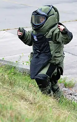 La tenue lourde d'un démineur pèse trente kilogrammes et est principalement constituée de kevlar. La protection est plus importante de face que de dos. En raison de la précision de son travail, le démineur ne porte pas de gants. Il doit donc tenir ses mains derrière le dos et rester face à la bombe[17].