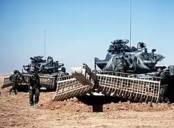 - Charrue à mines : Une charrue de mine est généralement montée sur un char ou un véhicule de génie militaire. Les mines terrestres enfouies sont déterrées et poussées hors de la trajectoire du char ou renversées. Lorsque le char passe au-dessus de la mine, elle dépensera son souffle vers le bas plutôt que vers le haut, causant des dégâts insignifiants[6].