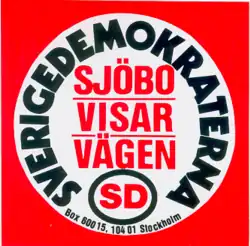 Autocollant des débuts du parti : « Sjöbo montre la voie » (Sjöbo est une commune dont le maire centriste avait, en 1988, organisé un référendum contre l'accueil de réfugiés (sv)).