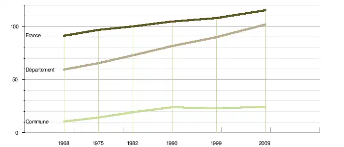 Le taux de mortalité est quant à lui passé de 12,7 ‰ sur la période 1968-1975 à 4,4 ‰ sur la période 1999-2009[5]. Celui du département était sur cette dernière période de 7,6 ‰ et celui de la France de 8,8 ‰[7].