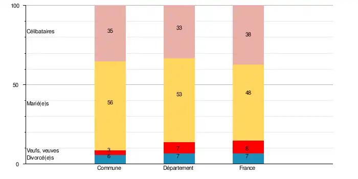En 2009, la commune comptait 34,5 % de célibataires, 56,4 % de personnes mariées, 3,4 % de veufs ou veuves et 5,7 % de divorcé(e)s[10]. Le taux de personnes mariées apparaît ainsi supérieur à celui du département (52,5 %)[11] mais aussi de la France (47,5 %)[12].