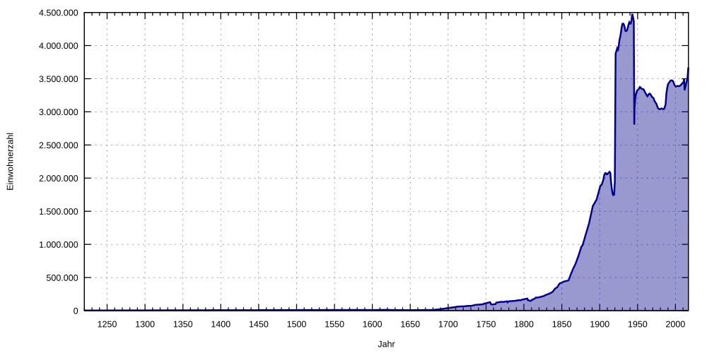 Au début de son histoire en 1220, Berlin était une petite île sur la Sprée de 1 200 habitants. L'immigration des huguenots français à la suite de l'Édit de Potsdam en 1685 a donné une forte impulsion à la ville, alors peuplée de 10 000 habitants. Sa superficie et sa population ont progressé jusqu'en 1747 où elle a dépassé la barre des 100 000 habitants. Le siècle suivant était celui de l'industrialisation et du boom démographique de la ville qui a dépassé le million d'habitants en 1877. L'intégration des communes limitrophes pour créer le grand Berlin en 1920 a fait de la ville pendant les années 1920 et 1930 la plus grande ville du continent européen et la troisième ville du monde après New York et Londres. Elle a connu sa plus grande population pendant la période du national-socialisme en 1942 avec 4 478 102 habitants, avant de baisser drastiquement à la fin de la Seconde Guerre mondiale à 2 807 405. La population a ensuite très légèrement augmenté de quelques dizaines de milliers d'habitants pendant la partition, avant d'accuser une légère baisse après la réunification à la fin des années 1990. La population actuelle augmente aujourd'hui très lentement. La croissance démographique était en 2010 de 5,2 ‰ surtout grâce à un solde migratoire de 4,9 ‰. Le nombre d'enfants par femme en 2012 est de 1,34. Le recensement de 2011 a néanmoins revu à la baisse les estimations précédentes des vingt dernières années[5]. Cet écart statistique entre le recensement et les estimations a créé une forte polémique médiatique nationale[6] et a eu des conséquences graves sur le budget de la ville de Berlin qui a depuis porté plainte.