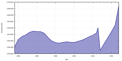 Après la chute du mur de Berlin le , le solde naturel global de Berlin était très négatif, alors que la ville a continué à accueillir plus de personnes qu'elle n'en a perdu jusque fin 1995. La population a décru pendant toute la fin des années 1990, avant de stagner au début des années 2000. Le nombre d'enfants par femme était de 1,10 en 1991, 1,06 en 1995, 1,18 en 2000 et de 1,19 en 2005[41]. L'espérance de vie à la naissance était quant à elle de 78,17 ans pour les femmes et de 71,57 ans pour les hommes en 1993. Huit ans plus tard, en 2001, elle avait progressé un peu moins vite pour les femmes (81,06 ans ; + 2,89) que pour les hommes (75,23 ans ; + 3,66). En 2009, une femme peut espérer vivre 82,35 ans et un homme 77,38[42]. L'accroissement démographique de la capitale allemande a recommencé en 2005 et s'est confirmé depuis. Il n'y eut cependant pendant cette vingtaine d'années que des estimations et aucun vrai recensement.