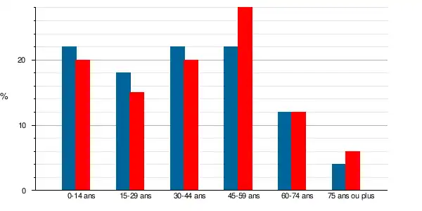 Le premier recensement exhaustif de la commune dans le cadre du nouveau dispositif de recensement de la population a eu lieu en 2004. Pour les communes de moins de 10 000 habitants, le recensement étant réalisé tous les 5 ans, 2009 est une année de recensement exhaustif. La répartition de la population de 15 ans ou plus par sexe, âge et état matrimonial légal en 2009 est présentée dans le tableau suivant.