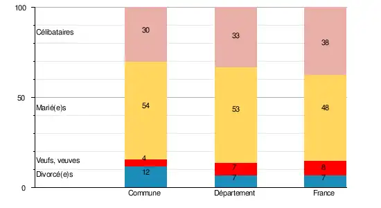 En 2009, la commune comptait 30,4 % de célibataires, 53,7 % de personnes mariées, 4,4 % de veufs ou veuves et 11,5 % de divorcé(e)s[10]. Le taux de personnes mariées apparaît ainsi supérieur à celui du département (52,5 %)[11] mais aussi de la France (47,5 %)[12].
