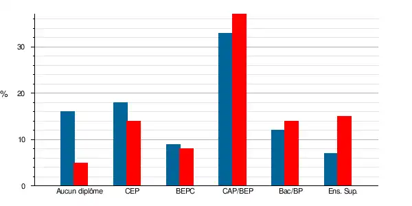 | Titulaires d'un CAP ou d'un BEP | 89 | 36,6 % | 72 | 33,2 % | 26,5 | 27,6 | 24 | 25 |