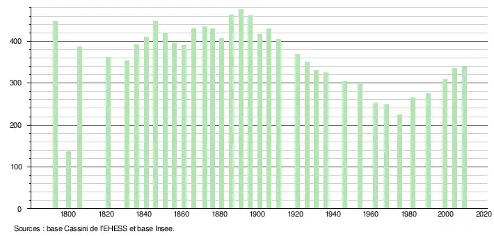 L'évolution du nombre d'habitants est connue à travers les recensements de la population effectués périodiquement dans la commune depuis 1793. Après avoir connu un maximum en 1896 avec 461 habitants, la commune connaît un déclin démographique continu jusqu'en 1975 avec un minimum à 225 habitants. La population de la commune croît ensuite à nouveau modérément.