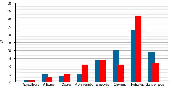 La commune comptait par ailleurs, en 2009, 688 retraités, soit 41,7 % de la population de la commune et 14,4 % de plus que le taux départemental. Cet écart s'est toutefois réduit par rapport à celui de 1999 puisqu'il était alors de 11 %.