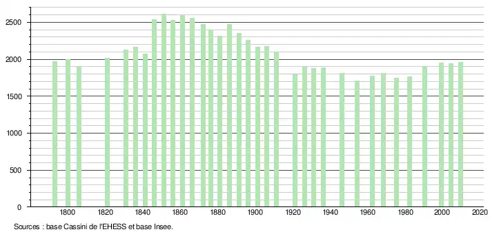 L'évolution du nombre d'habitants est connue à travers les recensements de la population effectués périodiquement dans la commune depuis 1793. Après avoir présenté un maximum en 1851 avec 2 613 habitants, la population de la commune diminue légèrement et se stabilise au XXe siècle.