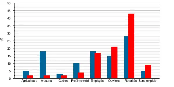 La commune comptait par ailleurs, en 2009, 80 retraités, soit 42,6 % de la population de la commune et 15,3 % de plus que le taux départemental. Cet écart s'est toutefois réduit par rapport à celui de 1999 puisqu'il était alors de 5,1 %.