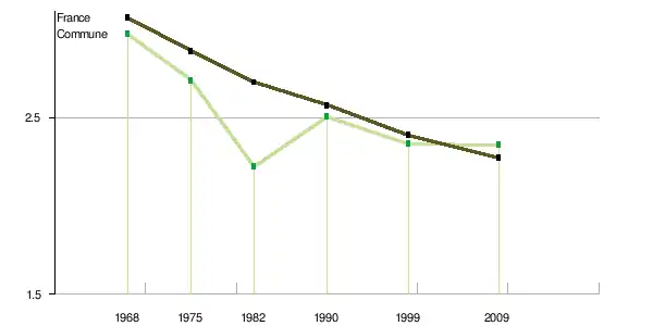 Le nombre de ménages[Note 3] tend à croître plus vite que la population : + 1,72 % par an en moyenne en France métropolitaine pour le nombre de ménages entre 1968 et 2009, + 0,74 % pour la population (tableau ci-après). Le nombre moyen de personnes par ménage tend en effet à baisser : égal à 3,06 en 1968, il n’est plus que de 2,4 en 1999 et de 2,27 en 2009[16]. La tendance est similaire pour la commune. Le nombre moyen de personnes par ménage tend également à baisser : égal à 2,97 en 1968, il n’est plus que de 2,35 en 1999 et de 2,34 en 2009[13].