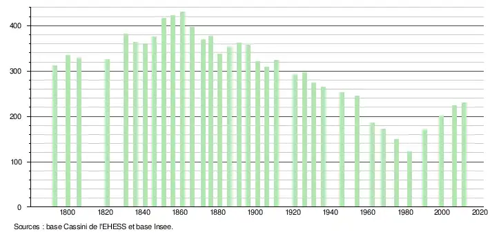 L'évolution du nombre d'habitants est connue à travers les recensements de la population effectués périodiquement dans la commune depuis 1793. Après avoir présenté un maximum en 1861 avec 430 habitants, la population de la commune diminue jusqu'en 1982 avec un minimum à 122 habitants puis croît modérément.