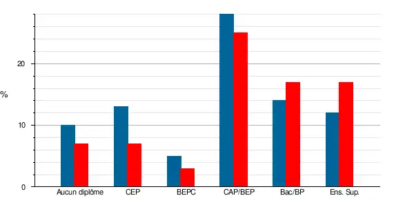 | Titulaires du certificat d'études primaires | 57 | 6,6 % | 72 | 12,5 % | 11,2 | 18,4 | 11,1 | 17,6 |