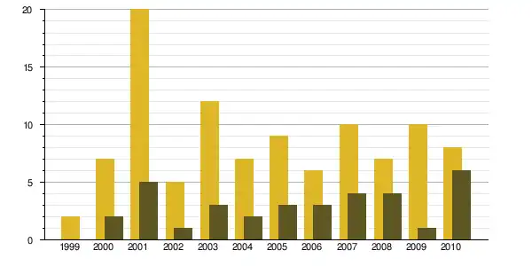 | 1968 à 1975 | 1975 à 1982 | 1982 à 1990 | 1990 à 1999 | 1999 à 2009 | ||