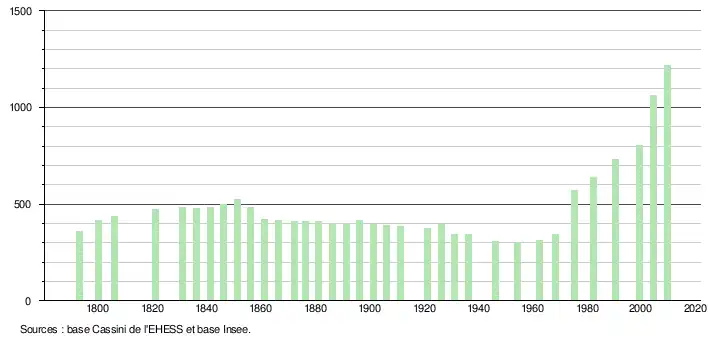 L'évolution du nombre d'habitants est connue à travers les recensements de la population effectués périodiquement dans la commune depuis 1793. Après une phase de relative stabilité au XIXe siècle et au début du XXe siècle, la commune connaît une très forte croissance à partir de 1962 puisque celle-ci quadruple quasiment en 40 ans.