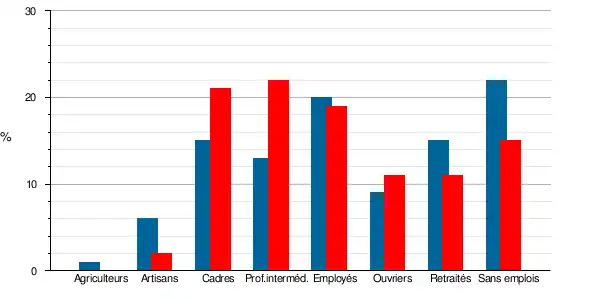 | Artisans, commerçants, chefs d'entreprise | 20 | 2,1 | 36 | 5,5 | 3,7 | 4,2 | 3,3 | 3,5 |