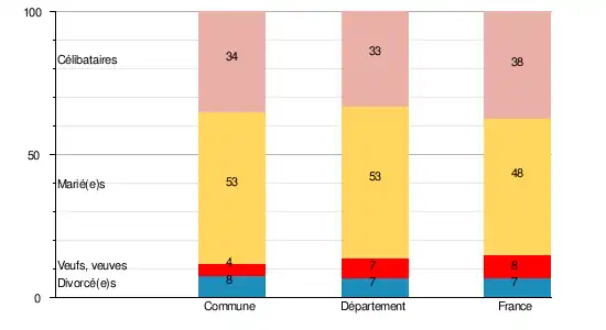 En 2009, la commune comptait 34 % de célibataires, 53,3 % de personnes mariées, 4,3 % de veufs ou veuves et 8,4 % de divorcé(e)s[11]. Le taux de personnes mariées apparaît ainsi supérieur à celui du département (52,5 %)[12] mais aussi de la France (47,5 %)[13].