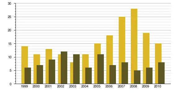 | 1968 à 1975 | 1975 à 1982 | 1982 à 1990 | 1990 à 1999 | 1999 à 2009 | ||