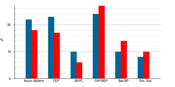 | Titulaires du certificat d'études primaires | 36 | 16,5 % | 45 | 23,1 % | 12,4 | 19 | 11,1 | 17,6 |