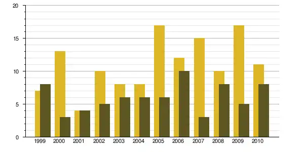 | 1968 à 1975 | 1975 à 1982 | 1982 à 1990 | 1990 à 1999 | 1999 à 2009 | ||