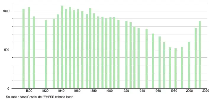 Le taux de mortalité est quant à lui passé de 10,4 ‰ sur la période 1968-1975 à 8,5 ‰ sur la période 1999-2009[5]. Celui du département était sur cette dernière période de 7,6 ‰ et celui de la France de 8,8 ‰[8].
