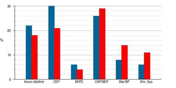 | Titulaires du certificat d'études primaires | 127 | 20,9 % | 140 | 29,9 % | 11,2 | 18,4 | 11,1 | 17,6 |