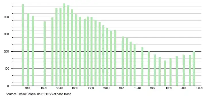 L'évolution du nombre d'habitants est connue à travers les recensements de la population effectués périodiquement dans la commune depuis 1793. Après avoir présenté un maximum en 1851 avec 466 habitants, la population de la commune diminue jusqu'en 1975 avec un minimum à 147 habitants puis croît modérément.