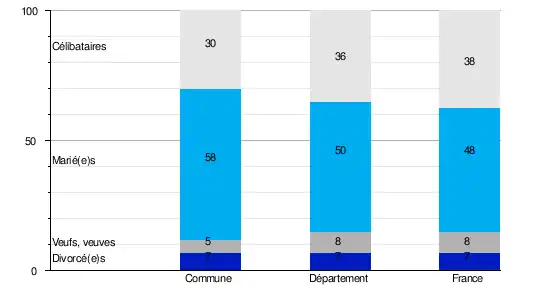 L'état matrimonial légal désigne, selon l'Insee, la situation conjugale d'une personne au regard de la loi : célibataire, mariée, veuve, divorcée[Note 2].En 2009, la commune comptait 30,3 % de célibataires, 58,1 % de personnes mariées, 4,5 % de veufs ou veuves et 7,1 % de divorcé(e)s[13]. Le taux de personnes mariées apparaît ainsi très supérieur à celui du département (49,8 %)[14] mais aussi de la France (47,5 %)[15].