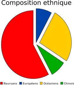 Composée en majorité de Nauruans, la population comprend également des Chinois, des Océaniens et des Occidentaux. La langue officielle est le nauruan (l'anglais étant également très parlé) et la religion principale est le christianisme (majoritairement protestantisme)[13].