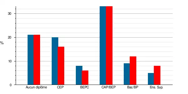 | Titulaires du certificat d'études primaires | 384 | 16 % | 435 | 20,2 % | 12,4 | 19 | 11,1 | 17,6 |