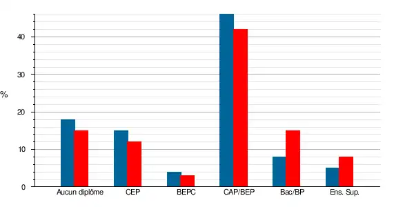 Le taux de personnes non scolarisées sans diplôme a diminué entre 1999 (18,2 %) et 2009 (15,2 %)[17]. Il est inférieur à celui du Loiret (18,3 %) et à celui de la France métropolitaine (18,3 %)[18]. Parallèlement le taux de personnes titulaires d'un diplôme de l'enseignement supérieur long est passé de 3,5 % en 1999 à 4,9 % en 2009, un taux inférieur à celui du Loiret (10,5 %)[19] et au taux national relatif à la France métropolitaine (12,7 %)[18].