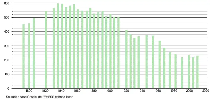 Le taux de mortalité est quant à lui passé de 15,3 ‰ sur la période 1968-1975 à 3,9 ‰ sur la période 1999-2009[5]. Celui du département était sur cette dernière période de 8,5 ‰ et celui de la France de 8,8 ‰[8].
