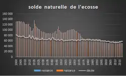En 2002, le nombre des naissances a été le plus bas jamais enregistré avec 51 270 naissances. Ce chiffre a cependant été supérieur en 2004 avec 53 957 naissances, et devrait être encore plus élevé en 2005[3]. Depuis 1997, l’Écosse a été témoin d’un décroissement naturel de population, les décès étant plus nombreux que les naissances. Pour ne citer qu’un exemple, pour l’année 2004, il y a eu 4 012 décès de plus que de naissances.