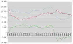 | 1990 | 1 570 599 | 22 304 | 14,2 | 2,05 | 19 531 | 12,4 | 1,8 | −5 263 | - 1,8 |